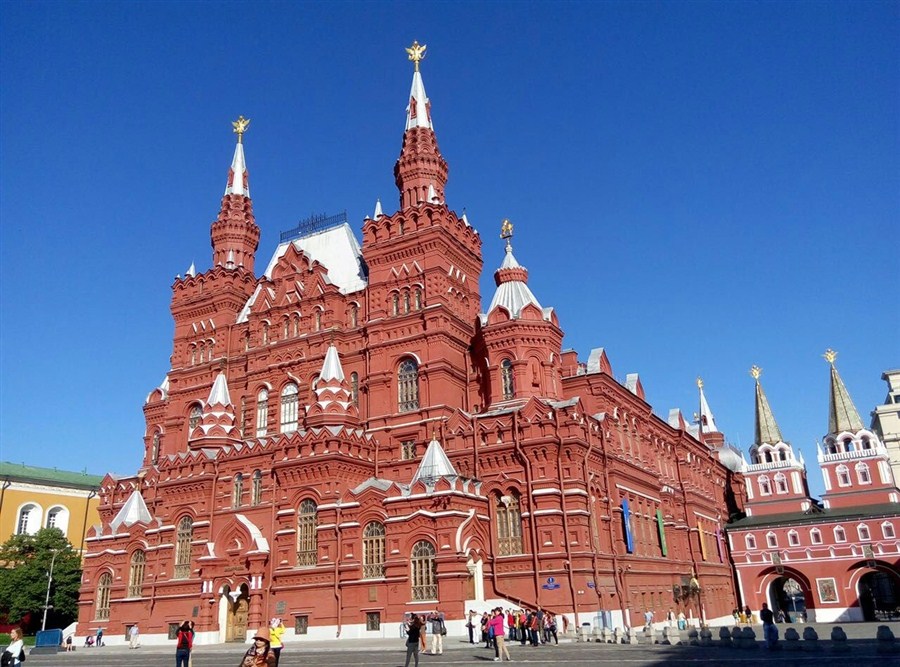 早餐后参观红场及周边景观(时间约1个小时)。红场是莫斯科的心脏,意为“美丽的广场”。红场周边景观有圣瓦西里升天大教堂(外观)、列宁墓(视情况而定,周一,周五关闭)、国家历史博物馆(外观)、莫斯科最大的古姆百货商场、亚历山大花园、无名烈士墓、长明火、朱可夫雕像。