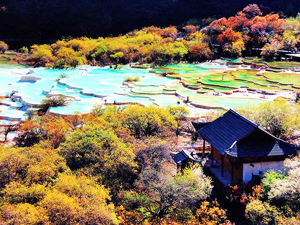 ②选择乘索道(上行80元/人,下行40元/人 费用自理),索道将游客送至与最高点五彩池景区海拔持平的地方,走平路(栈道)2900米到达黄龙主景区五彩池,游览后沿下山栈道,一路观看黄龙景点,返回黄龙景区大门口。